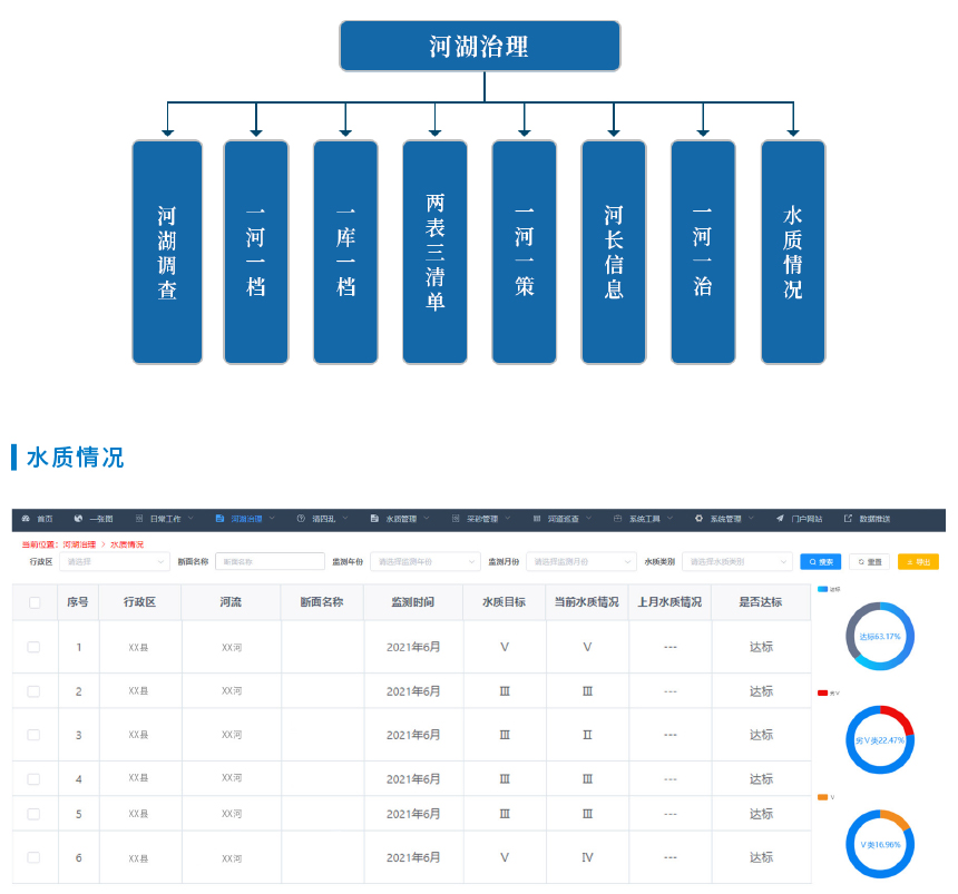 系統(tǒng)主要功能包括:河長制綜合展示、一張圖、河湖治理、清四亂、水質(zhì)管理、采砂管理、河道